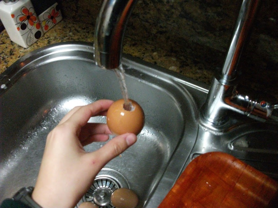 1. Haz un agujerito al huevo por la parte de abajo (la más ancha). Con un alfiler o puzón da un golpecillo para que se haga el agujero y luego ensáchalo con movimientos circulares. Saldrán la yema y la clara poco a poco.