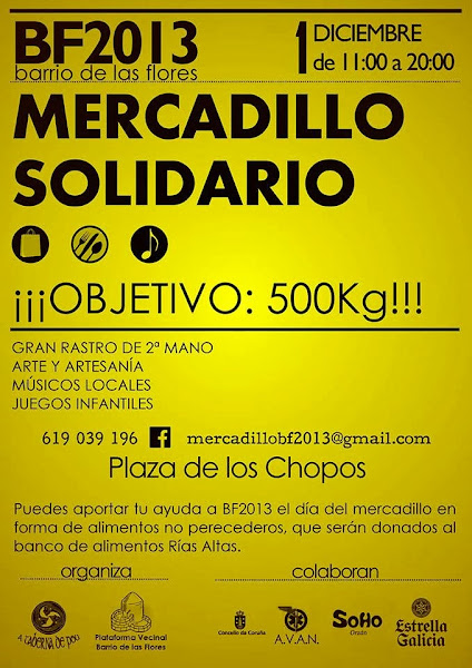 El próximo domingo 1 de Diciembre se celebrará en el Barrio de las flores, más concretamente en la Plaza de los Chopos, el Segundo mercadillo solidario, que colabora con el Banco de alimento Rías Altas para recaudar donaciones en forma de alimentos no perecederos para los más necesitados.