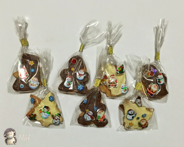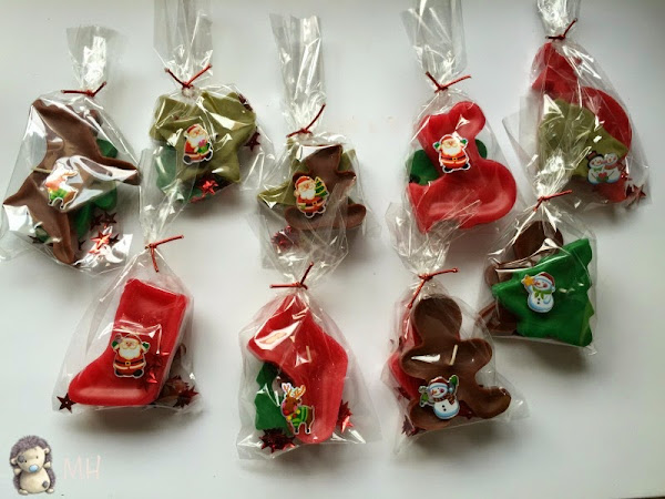 Seguimos con unas Galletas de mantequilla y canela como las que hice en otra ocasión, pero ahora cubiertas de chocolate (pintándolas con chocolate fondant) y envueltas para regalo (además puse en cada bolsita unas perlas comestibles plateadas, para entrar en ambiente).