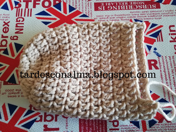 Para cerrar doblamos por la mitad (será el talón) revés con revés, osea mirando el derecho para fuera. Unimos la costura a pe introduciendo el ganchillo de delante hacia atrás por los bordes.