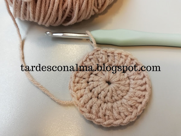1ª vuelta: empezamos con un anillo mágico enrollando el comienzo de la lana al rededor de nuestros dedos dos veces. Introduce la aguja de ganchillo dentro del anillo de delante hacia atrás a través del agujero formado, echa hebra sobre la aguja y desliza hacia ti . Echa hebra y cierra el punto. Ya tenemos la primera cadeneta dentro del anillo mágico. Haz dos cadenetas mas que servirán como primer pma (ésto pasará en todas las vueltas) y dentro del círculo formado hacemos 14 pma. Cerramos con 1pe en la tercera de las tres cadenetas (ésto pasará en todas las vueltas) En total son 15 pma dentro del círculo.