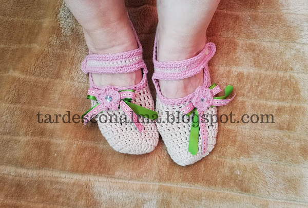 Las merceditas son de la talla 38. Si queremos hacer unas de mayor tamaño haremos unas vueltas más. De igual manera, si las queremos más pequeñas reduciremos las vueltas. Los dos ovillos dan para dos pares de merceditas, unas rosas ribeteadas en beis y otras beis ribeteadas en rosa. Al final del post dejo mas fotos de los distintos modelitos.
