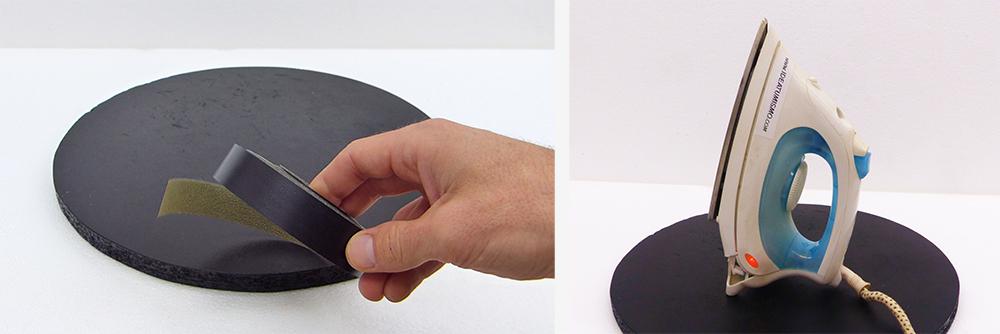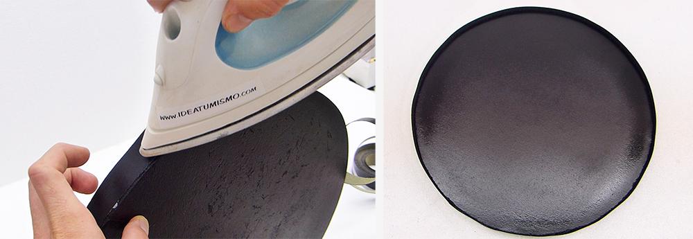 Lo primero que necesitamos es un soporte sobre el que poner las chapas. Yo he escogido una tabla de madera redonda. Y para que no se escape la resina por los lados voy a ponerle una cinta de las de cantear los tableros de melamina de manera que sobresalga un poco por la parte superior y pueda usarla a modo de contenedor. La pegaré a la tabla con la ayuda del calor de una plancha.Estas cintas vienen preencoladas por lo que solo las tenemos que situar en el canto de la tabla y presionar con la plancha. Hace tiempo te mostré como cantear un tablero de madera. Una vez lo tengamos tiene que quedarte como en la imagen.