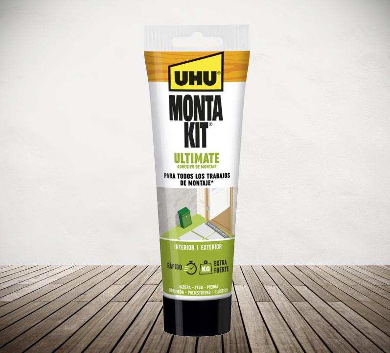 Voy a pegar las chapas a la mesa con eladhesivo MontaKit Ultimate de UHU. Se trata de un adhesivo denso y fuerte, con gran capacidad de relleno.