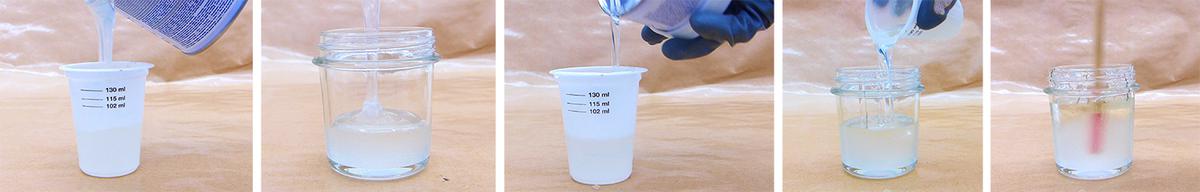 Tenemos que mezclar los dos compponentes en una porporción de 2A x 1B y que quede bien homogénea. Esto es importante para que a la hora de secar lo haga correctamente y más en este proyecto que la capa de resina que aplicaremos es mediananamente gruesa.