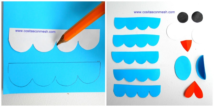 2.-En cartulina o papel de color, haremos unas ondas que serán el plumaje del búho, cortamos los otros moldes del búho, para hacer los ojos, pintamos con plumón negro las pupilas.