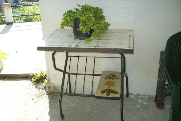Esta era una mesa de televisión antigua que estaba aparcada en un galpón de la finca en el estado que veis, y decidi darle otra utilidad, con unos azulejos tambien viejisimos .....