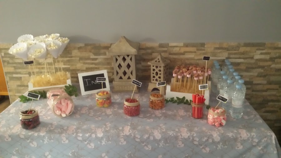 La mesa dulce del bautizo con golosinas, nubes, caramelos, piruletas, chuches, etc, que gustarán tanto a pequeños como a grandes!, Productos marcados Sin gluten.