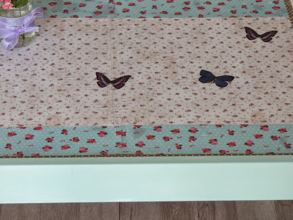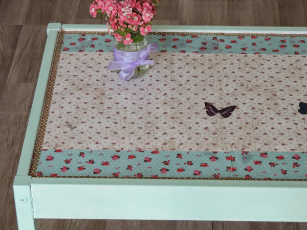 Después de arreglarle las patas y asegurarlas bien, he pintado con chalk paint color mint , si ese chalk paint que compré el otro dia en el hand made festival, podeis verlo AQUI todo lo que habia sido de color madera ahora es mint!!! y el sobre forrado con papeles de scrap varios y para que no lo estropee tan rapido se lo he forrado, plastificado vamos....y como ella es muy aficionada a rascar todos los papeles incluido el papel de su habitación, jajajaja pues he rematado alrededor del sobre con whassi tape , el resultado ha sido el siguiente......