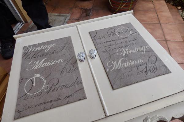 luego pegué los rectángulos forrados a las puertas de la mesita y les puse unos pomos muy bonitos que tengo desde hace tiempo.