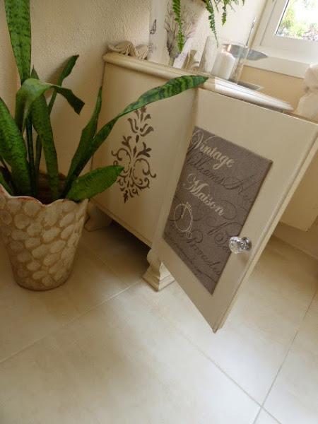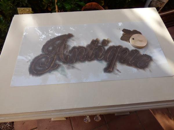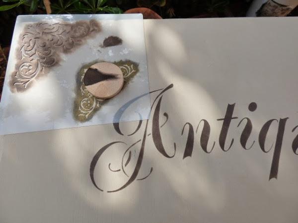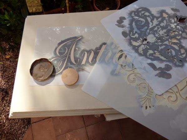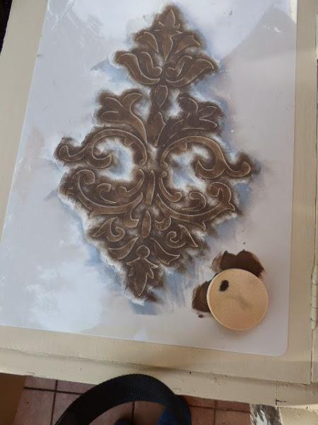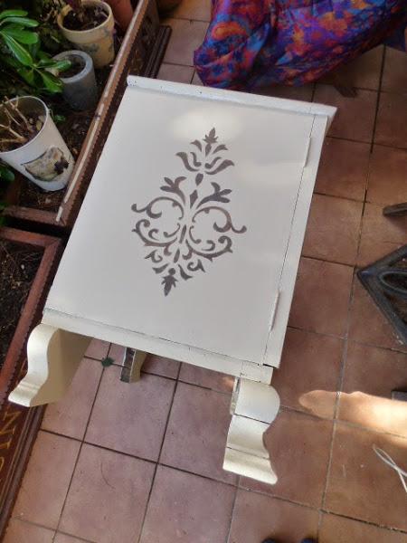 aún así, quería aclararla visualmente un poco, por lo que hice unos estarcidos con esta plantilla, con la misma Chalky Timeless que he pintado la mesita. No es una cosa que se vaya a lavar, así que se puede usar perfectamente la Chalky como si se tratase de una pintura textil.