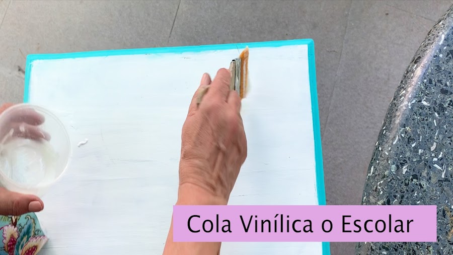 Luego con un pincel y cola vinílica , escolar o de carpintero pincelo el borde que recién marque con el lápiz , solo ese borde y lo realizo en los 4 lados y lo dejo que se seque y una vez que se seco lo recorto por la marca.
