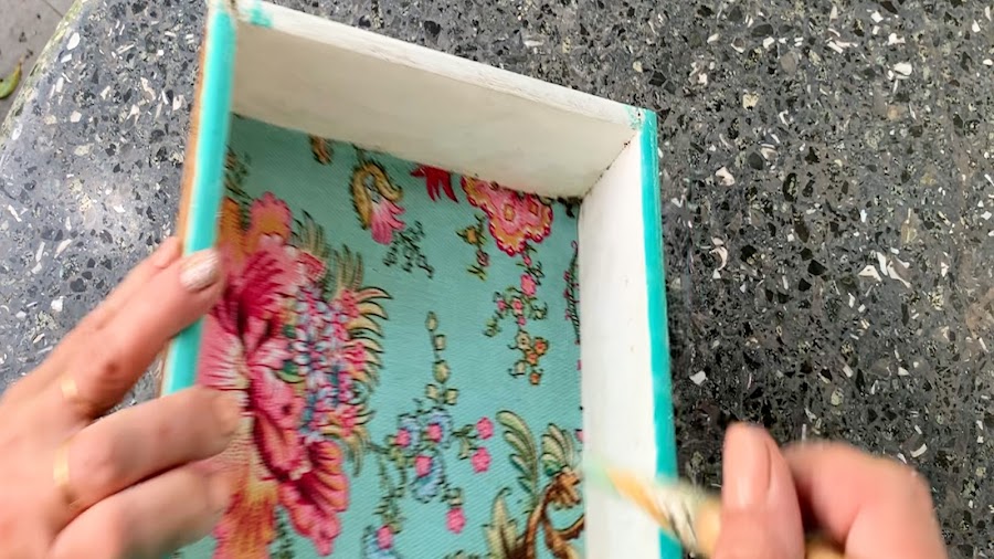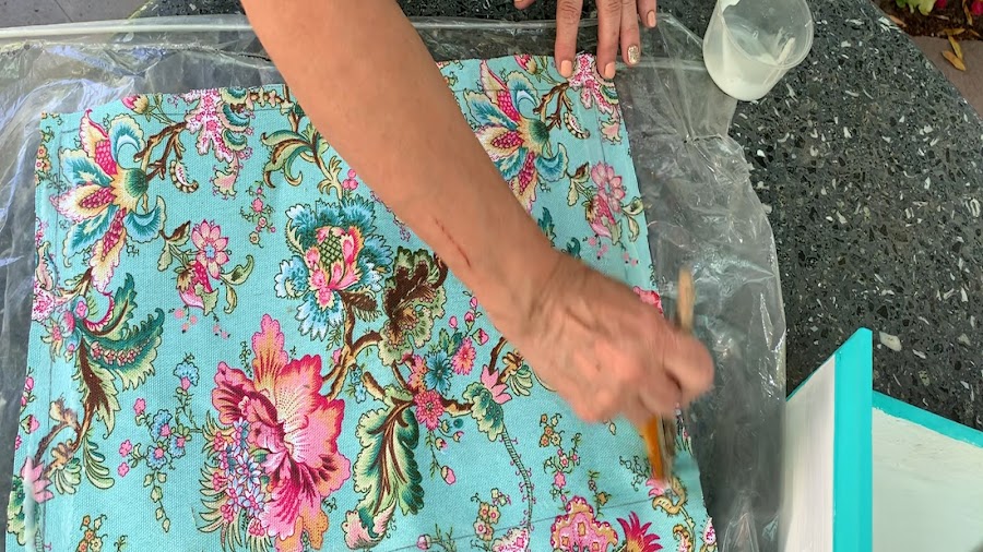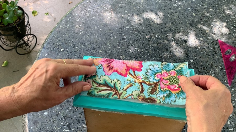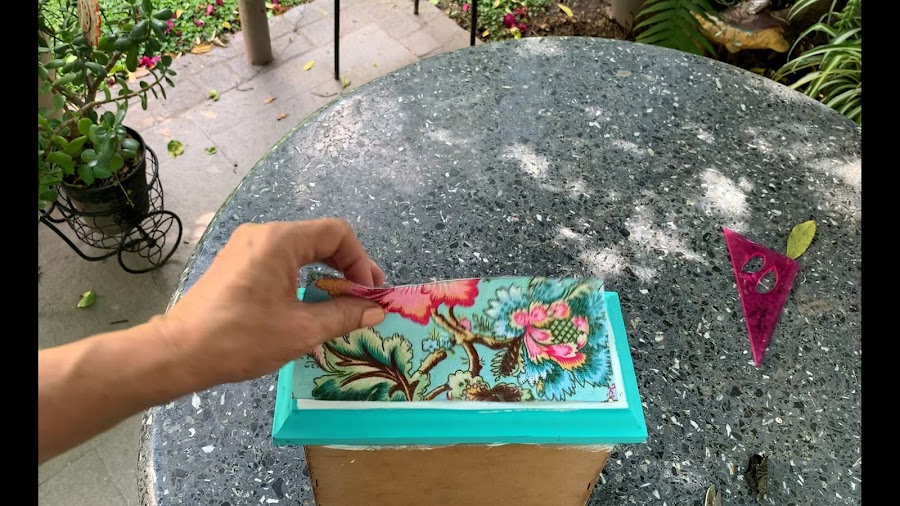 Al frente del cajoncito lo pincelo con pegamento en la parte blanca y le pego el trozo de tela ya recortado moviéndolo hasta cubrir esta superficie. Siempre para todas las partes levanten un poco la tela en los bordes porque suele tener menos pegamento y coloquen mas así se aseguran una buena adherencia.