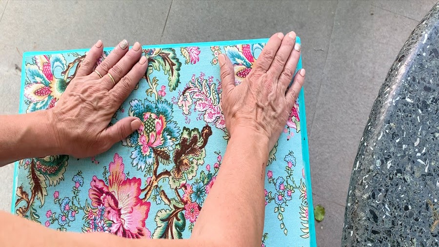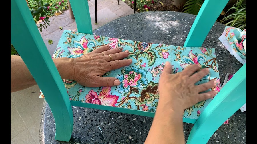 Recuerden que las telas en contacto con el pegamento se humedecen lo que las hace elásticas por un momento y esto lo debemos aprovechar para estirar o moverla si es necesario para emparejar el pegado.