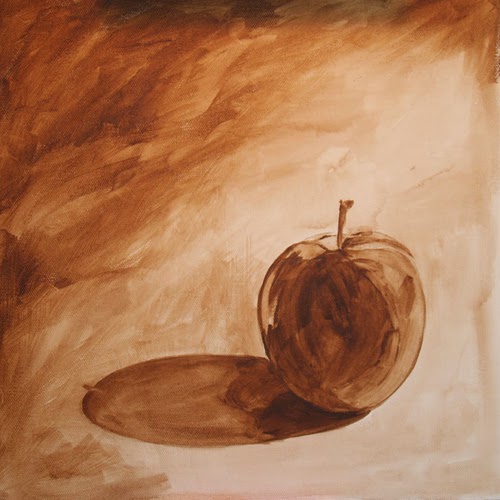 El primer paso es en realidad tres pasos en uno: El dibujo, la imprimación (sólo para entonar el lienzo) y el manchado para establecer las luces y las sombras.