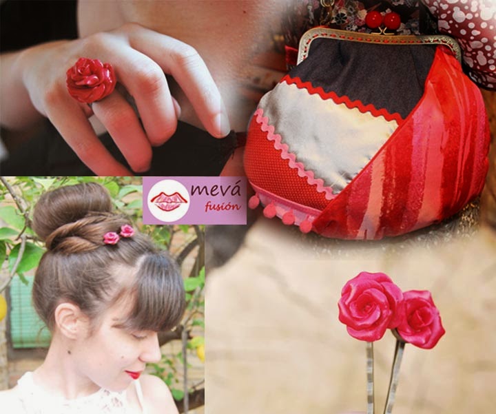 El color rojo pasión, las delicadas y perfectas rosas enredadas en el pelo, y en las manos... y todo fusionando perfectamente con nuestro bolso... ¡puro glamour!