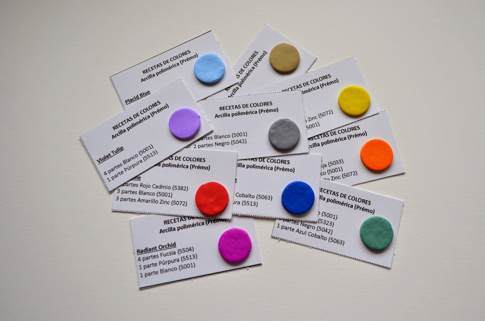 Puedes crear tus propias mezclas de colores personalizados y apuntar la receta para repetirlo cuando quieras, o puedes hacer los colores de esta primavera - verano con las recetas que te pongo a continuación (están hechas con arcilla de la marca Prémo y te indico junto a cada color el código numérico):