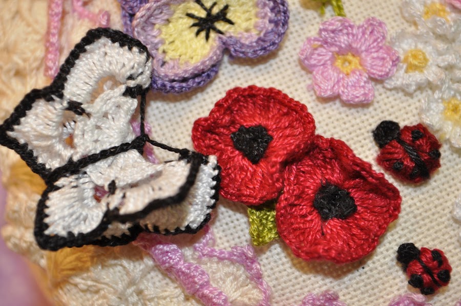 Y para las flores, las mariquitas, las hojas y las mariposas,con un ganchillo del 0,65.Los dos de la casa Dama que para mi son los mejores,los de toda la vida y los hilos que tenía de dalia del 50.