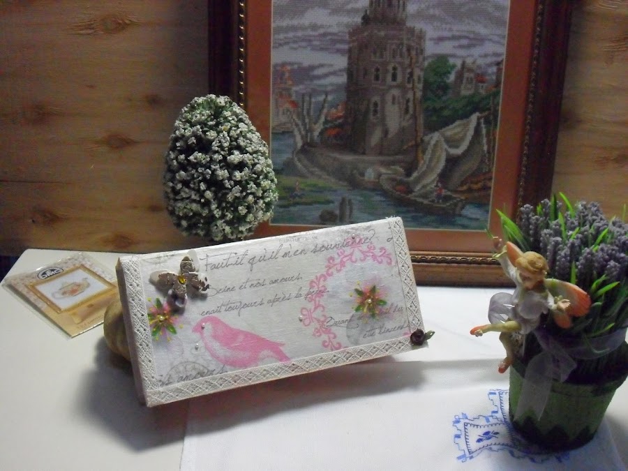 El otro día arreglando un armario en mi casa, me encontré mi vieja caja donde guardaba las cosas para el punto de cruz, sí tuve una temporada bastante larga en la que me aficioné al punto de cruz e hice algunos cuadros, bueno la caja tampoco era nada del otro mundo pero en ella guardaba la tela, que estaba bordando, las tijeras, unos lápices para señalar el gráfico y la aguja, me daba pena tirarla aunque estaba bastante estropeada, así que decidí recuperarla, estaba así: