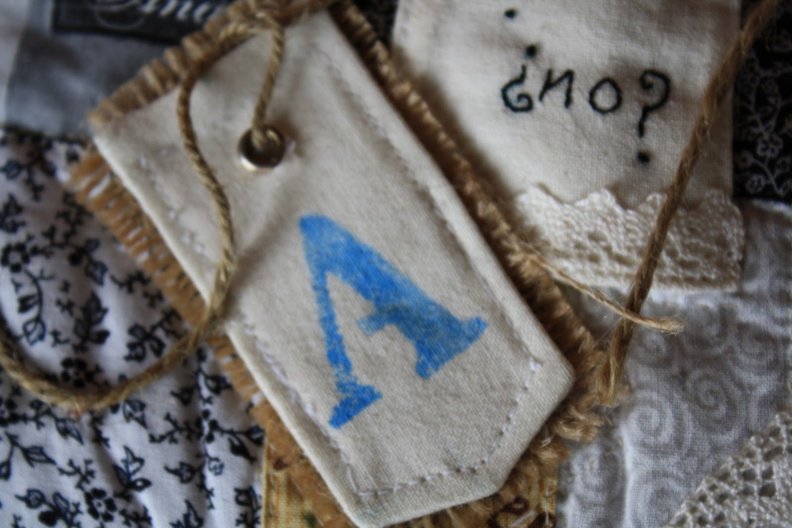 ...........etiqueta con la letra de su inicial en estarcir, realizada, con pintura en tela,claro esta.