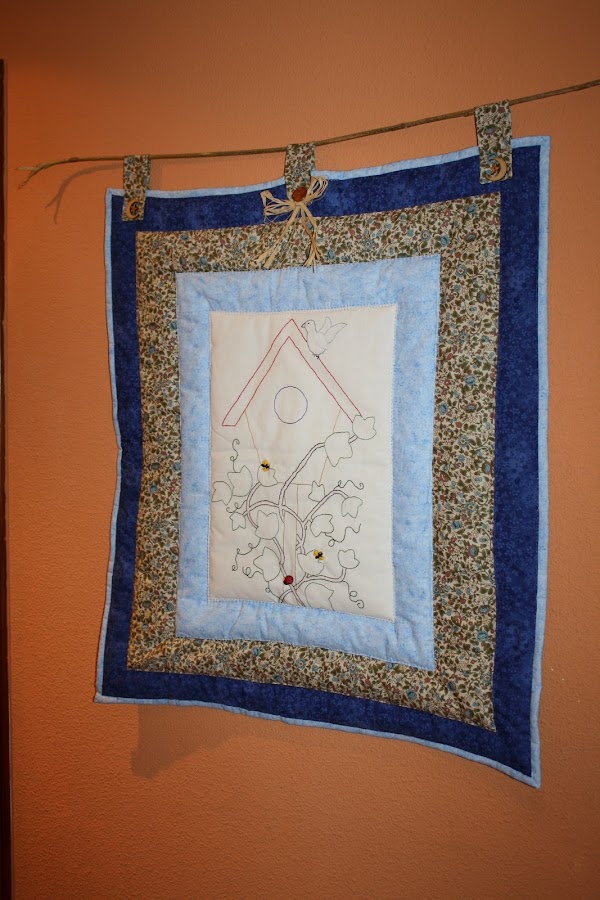 ...............bordado en rework con todas esas cositas que le gustan a mi tata; la casita de pájaros, las hiedras, el pájarito..........los colores azules, beige........