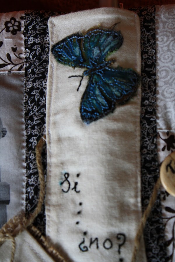 .............detalle del bolsillo para el bolígrafo, con una aplicación de una de esas mariposas que tanto le gustan.........y a puntada atrás una de sus famosas coletillas......
