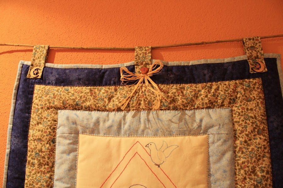 ...............bordado en rework con todas esas cositas que le gustan a mi tata; la casita de pájaros, las hiedras, el pájarito..........los colores azules, beige........