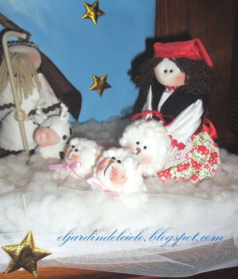 Os presento por fin mi belen. Lo hice el año pasado para mis hijas y fué el culpable de que me aficionara a la técnica soft. Lo montamos sobre una capa de nubes celestiales que mis hijas distribuyen por todo el salon en plan fiesta de la espuma. Estuve casi dos meses para hacerlo y este año le he añadido la cuna del niño jesús , un pescador con sus peces y la estrella . Quería hacer también los camellos de los reyes magos pero no he tenido tiempo ni se me ha ocurrido como hacerlos, pero todo se andará, igual para el día de los reyes magos aparecen.