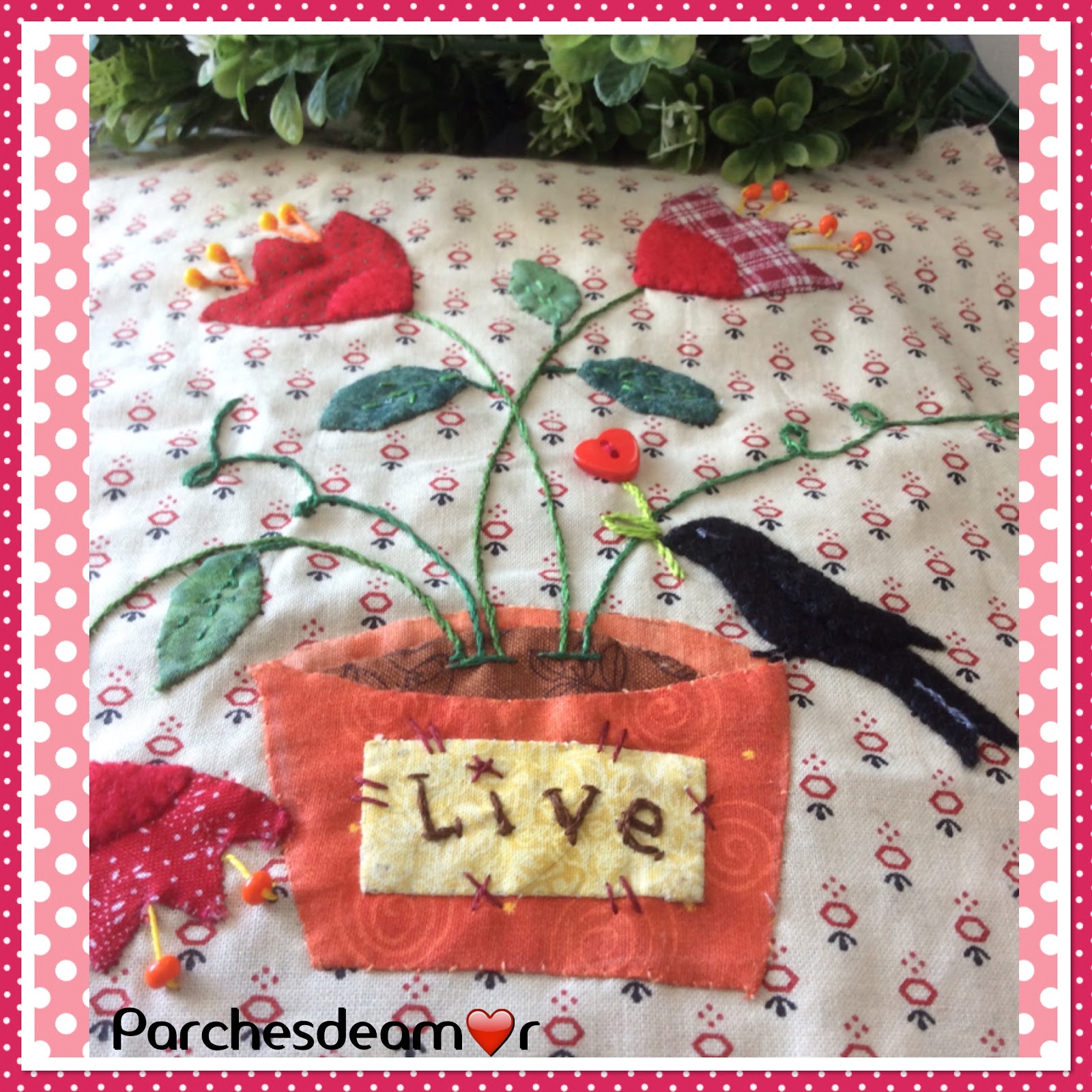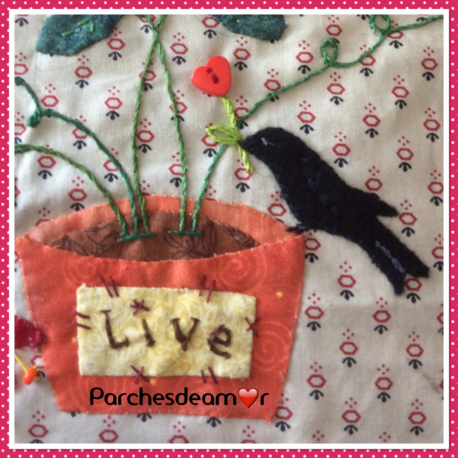 En el centro de la maceta emplee otro trozo de tela en color amarillo para crear el letrero "Live" Vivir!!! bella palabra no? con unos remates en puntadas country.