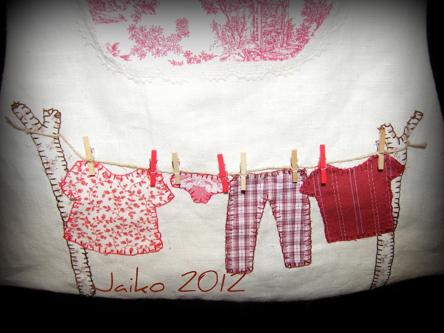 Para decorar la parte delantera se me antojó, y más después de ver en vivo y en directo esto... jejejjejej un tendedero con toooda la colada, lencería incluida. He intentado combinar telas estampadas en rojos y además le he puesto pinzas en miniatura.