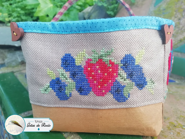 En el lado opuesto al perrito bordé también en punto de cruz unas fresas y unos arándanos.