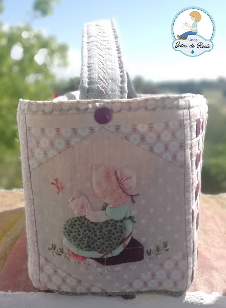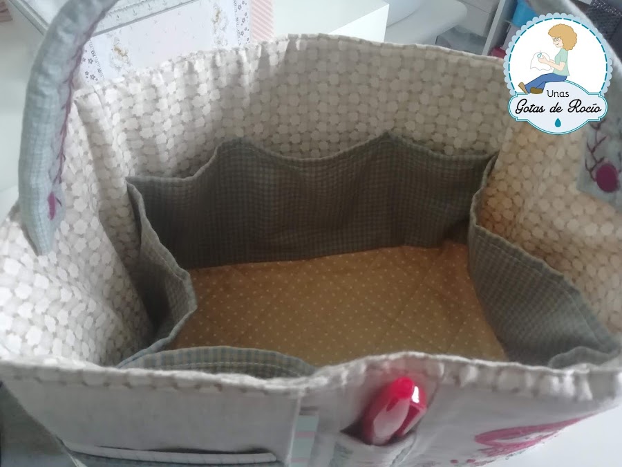 A lo que más vueltas he dado ha sido al asa. Quería que llevara asa, pero no quería que tapara los diseños de cada frente (me refiero a lo que le ocurre a esta caja pañalera, que aquí no supone ningún problema, pero en mi bolso sí). Además, pensaba que si bien un asa era imprescindible, en ocasiones podía ser un incordio, así que finalmente me decidí por un asa única en vez de dos (que era mi idea inicial), y sujeta con snaps, para poderla quitar en caso necesario. Y ha sido todo un acierto.