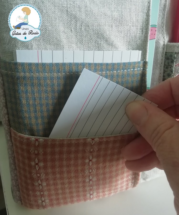 En este segundo frente he hecho una aplicación festoneada con un personaje muy querido para mí, Caperucita Roja, siguiendo el mismo dibujo que tantas veces he usado en mis delantales cuentacuentos. A los pies de Caperucita unas flores bordadas, una técnica muy usada por mí y como siempre digo: con la que más disfruto. El bolsillo para el bolígrafo tiene un diminuto vuelo de la oca que sigue las medidas del que nos enseñó Esperanza López en su curso de Patilargas. Y a su izquierda algunos bolsillos para libretas y fichas que siempre necesito para anotar ideas.
