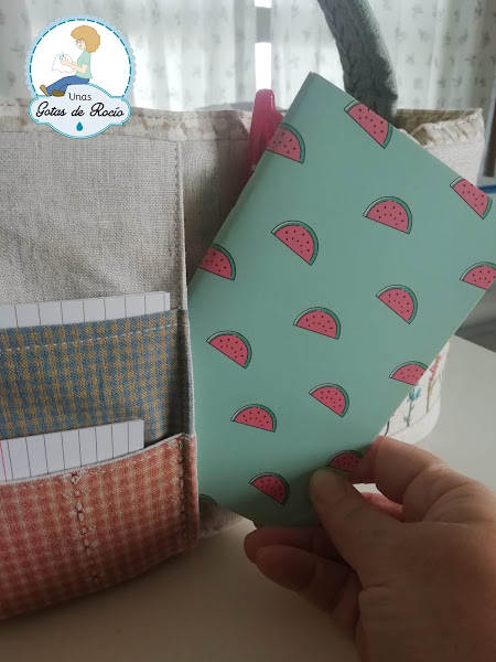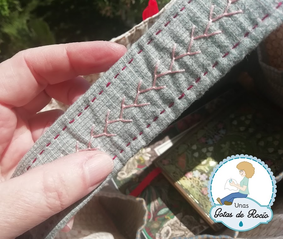 Es mi bolso de sofá. Sí, no es un costurero de sofá exactamente, es un bolso, pues lo he preparado pensando en poder tener a mano todo lo que necesito cuando me siento en mi sofá (pañuelos, gotas, libro, crema de manos, libreta con bolígrafo, y por supuesto la labor que tenga entre manos). Ya tengo un costurero en el salón de mi casa con lo necesario para no tener que subir continuamente a mi cuarto de costura, por eso insisto en que el trabajo que hoy te enseño es mi bolso de sofá.