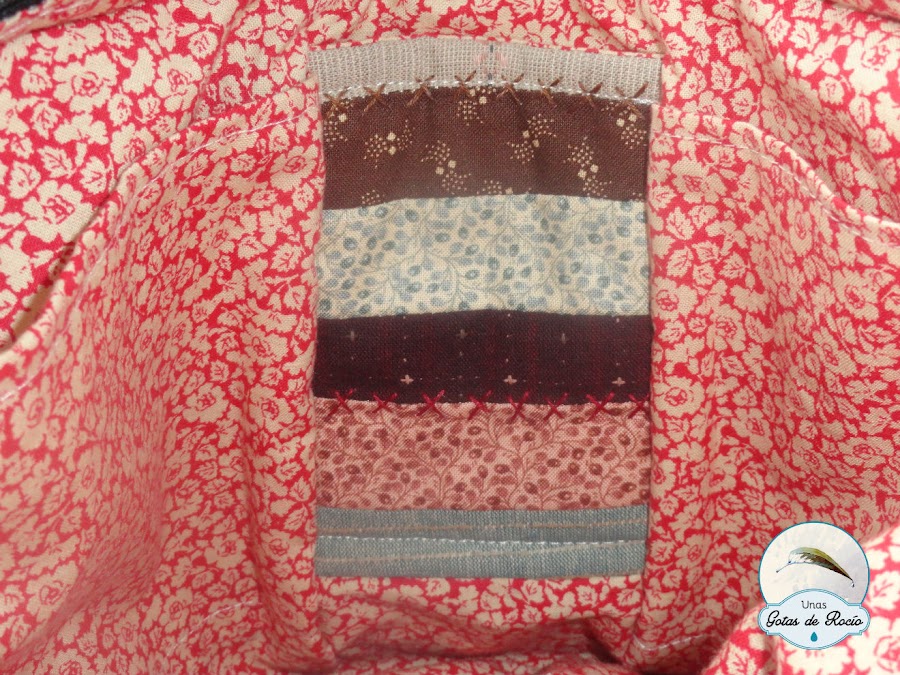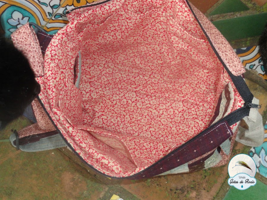 El bolso en total lleva 8 bolsillos: el exterior que ya habéis visto y el resto en el interior, ocupando toda la superficie del bolso. Los bolsillos interiores de los laterales los he hecho con las mismas telas del exterior.