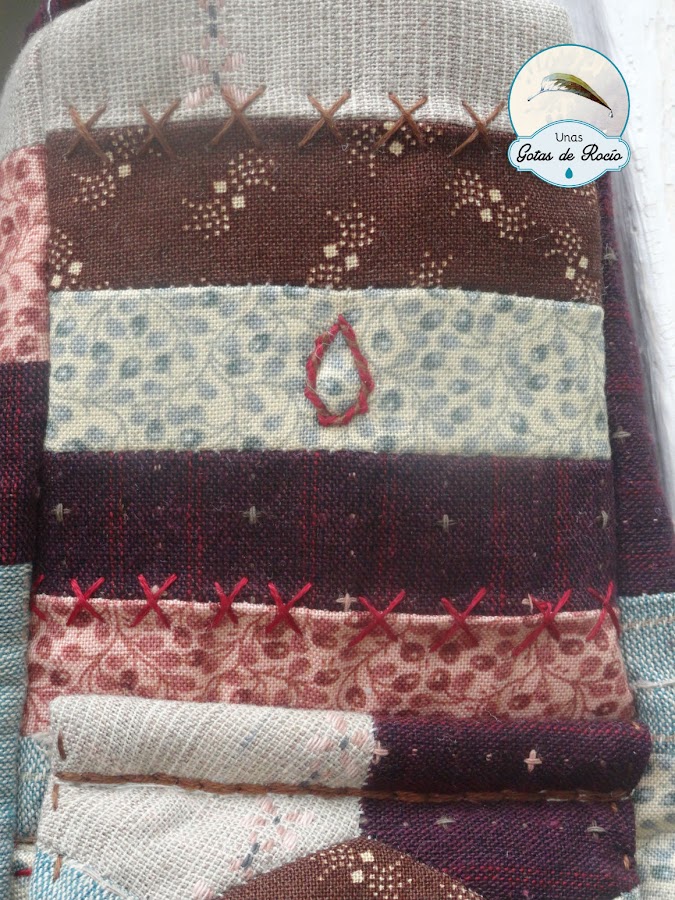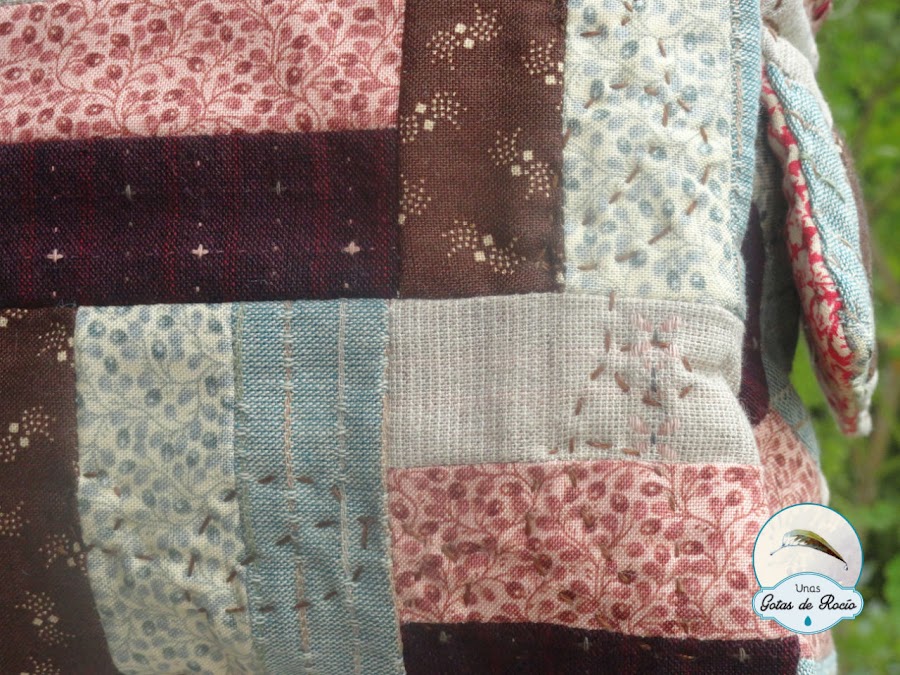 Los dos frontales los acolché con unas hojas, que me parecieron muy apropiadas para el aire otoñal que quería darle. Tan solo he acolchado las esquinas, lo suficiente para unir capas.