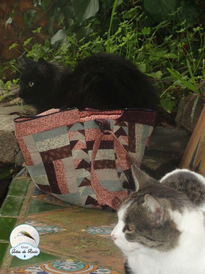 Durante la sesión de fotos comenzó de nuevo a llover, muuy fino, así que me refugié bajo un árbol para terminar de hacer fotos a todos los entresijos de mi bolso. Mi "familia" debió pensar que fue una buena idea, pues poco a poco se fueron acercando. Primero un par de gatos.