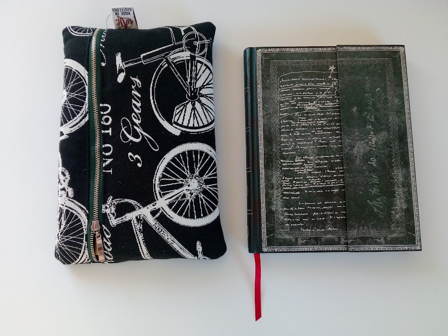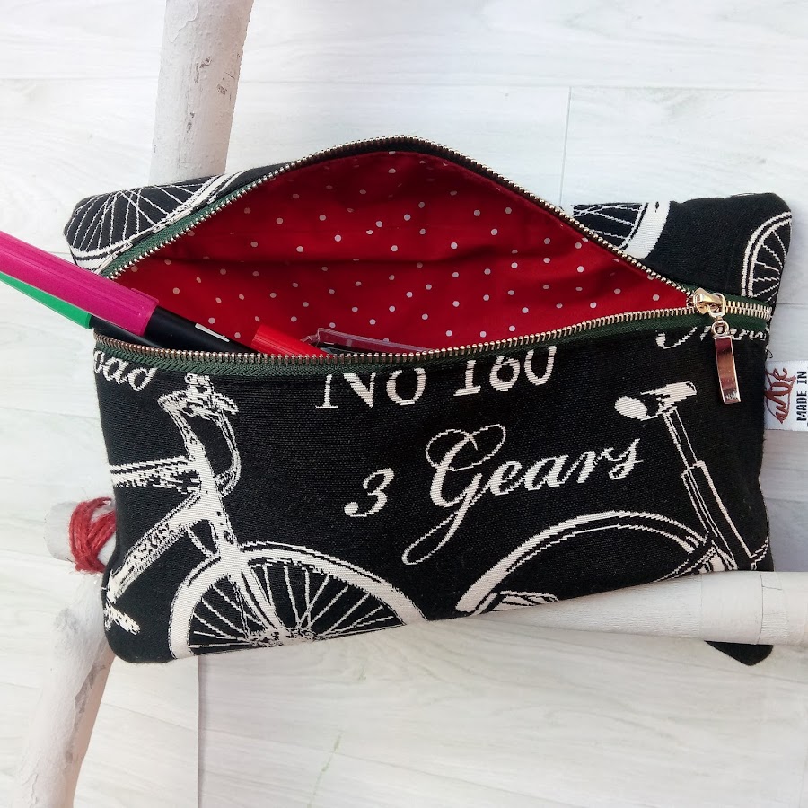 El exterior es una tela de doble cara con estampado bicicletas, es bastante grande para que me quepan los tombow, son bastante largos. Forrado con una tela super mona de topos.