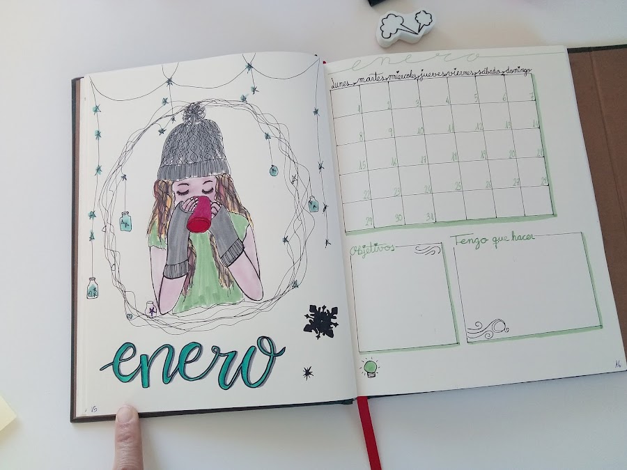 Y hasta aquí las listas anuales, a partir de aquí serán los meses con sus semanas. En esta página veis una portada de mes, el calendario y dos cuadrados para cosas importantes, que pasaran en enero pero que todavía no puedo apuntar en la semana que le toca o objetivos que me propongo en Enero.