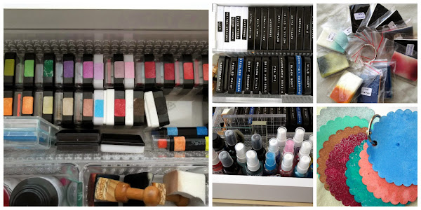 También he etiquetado otras tintas más grandes, como las Distress y me he hecho etiquetas para las tintas en spray que tengo. Las bolsitas para las almohadillas ya las tenía y a mi me resulta muy práctico para no mezclarlas.