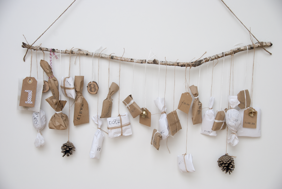 Lunes, 1 de diciembre, comenzamos con la cuenta atrás para la Navidad!!!! Este año, después de ver tantas ideas y tantos calendarios de adviento diferentes, al final, también me han entrado ganas de hacer el mío. Para ello, me bastó con un palo, algunos trozos de papeles kraft y blanco, cuerda de yute y unas piñas que le dan un toque más navideño. Ya solo tuve que hacer diferentes paquetitos donde guardar los dulces y caramelos que hacen más amena esta cuenta atrás hasta el día de Navidad, y colgarlos alrededor del palo. ¿A qué es sencillo? Pues ya está colocado formando parte de la decoración navideña de nuestro salón.¡Feliz lunes!