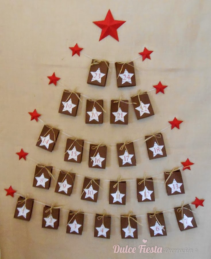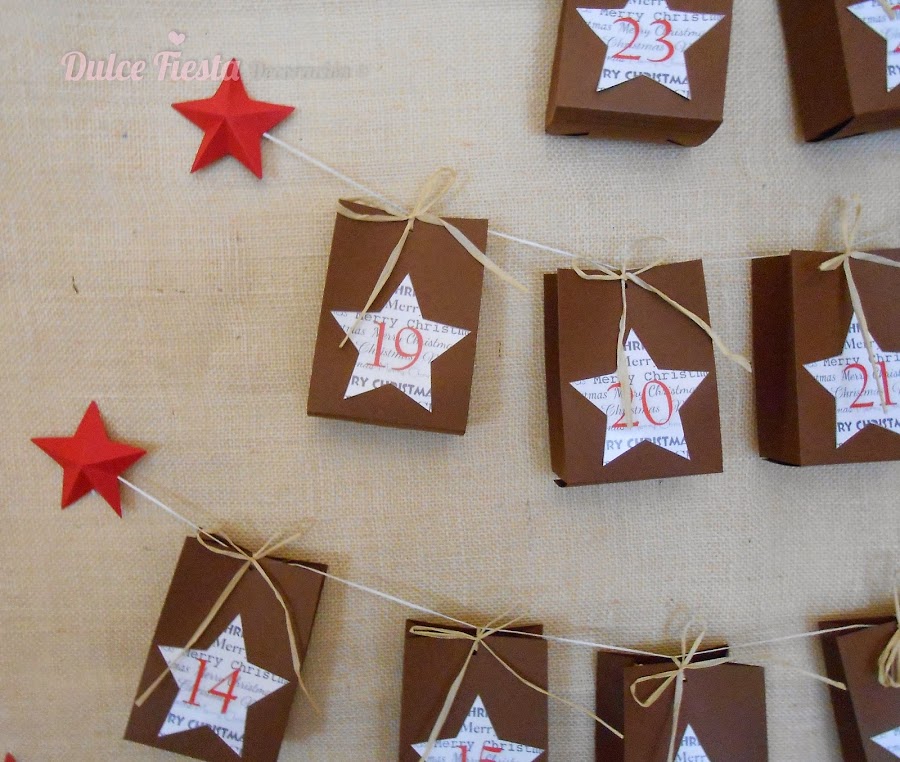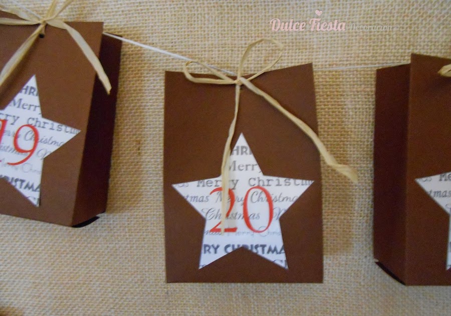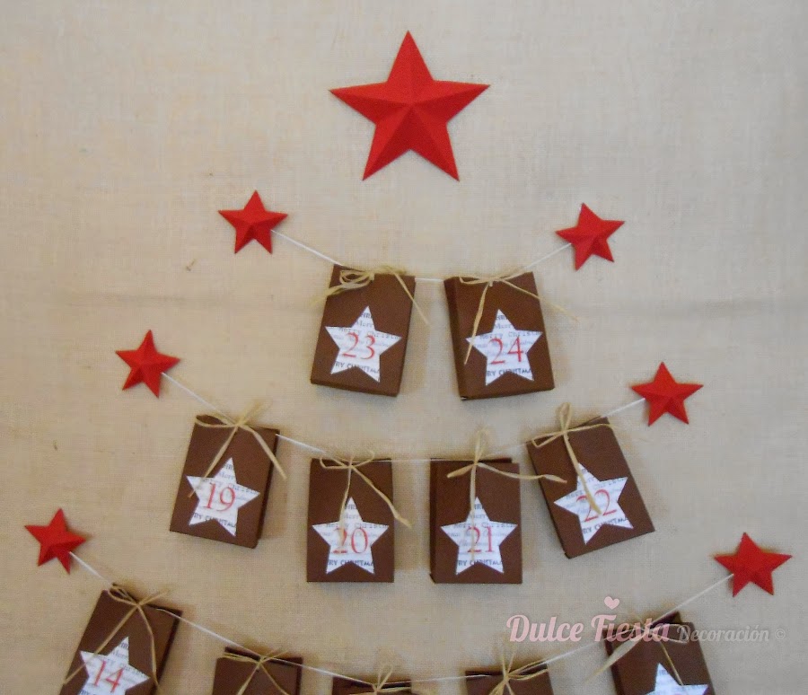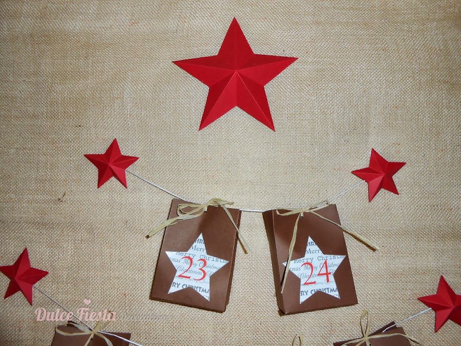 Una vez terminado de pegar todas las filas de cajitas colocamos la estrella grande encima.Y tan sólo habrá que esperar a que comience la cuenta atrás para ir abriendo las bolsas, una cada día. Para este año he decidido cerrar bien las bolsas con una lazada, porque otros años, el contenido iba desapareciendo por semanas jeje.