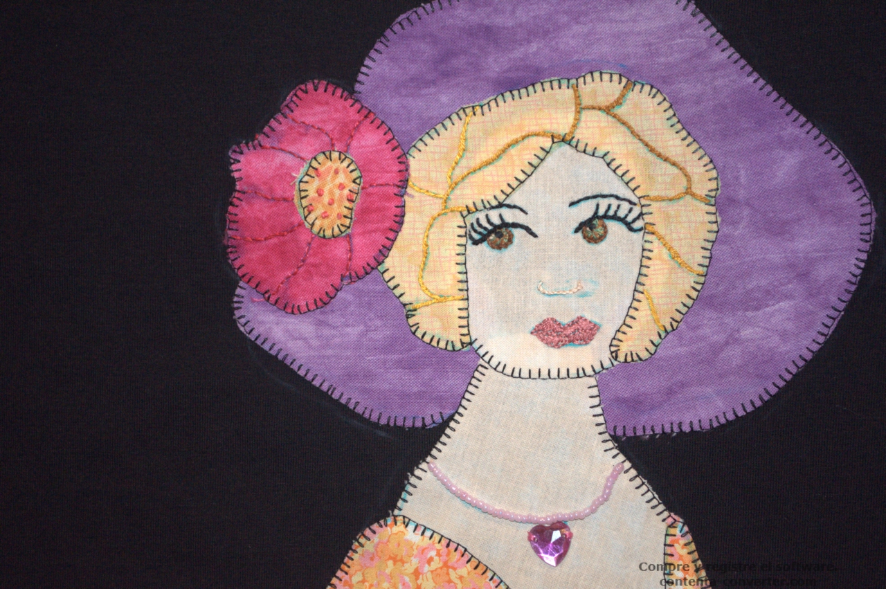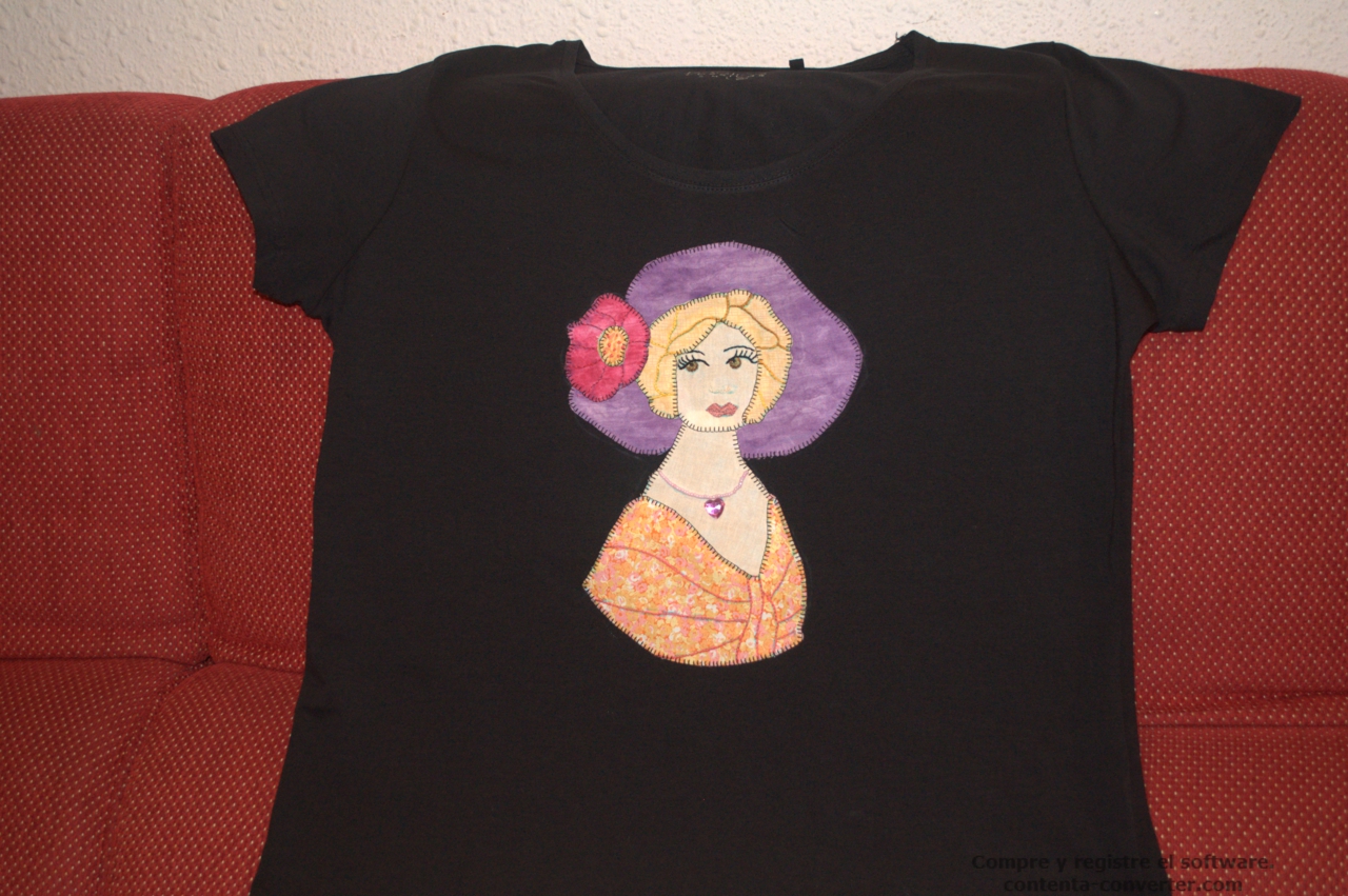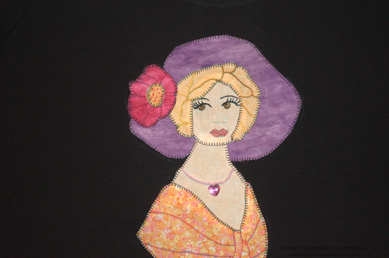 La dama es de una revista de vitrales,la vi y me encantó,busqué telas que le fueran bien a mis gustos y a la camiseta que al ser negra me lo facilitó bastante y me puse a ello.