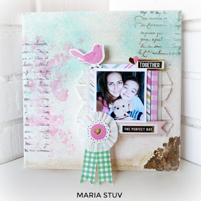 Por este motivo, en el lienzo (ademas de una foto con mi amor que es el centro sobre el que gira todo mi mundo y también en este caso, el mundo de mi canvas) encontráis el verde de los campos, el rosa a toques que representa a las preciosas flores, el marrón desquebrajado a propósito de la zona inferior representando a la tierra mojada, en la esquina inferior derecha tenéis un montoncito de fragmentos de gilded mica (que gane en un reto pasado de otra compañera) que representan el sol (porque a estos fragmentos cuando le da la luz resplandece), un pajarito cantando melodías que quedan escritas en el lienzo, los listones de las vallas blancas los tenéis debajo de la foto y el mantel de cuadritos de vichy rosas también lo tenéis encima de los listones de madera.