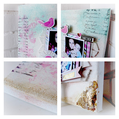 Una vez que se había secado todo, puse cola blanca en la esquina, eche los fragmentos de gilded mica y puse collage medium distrees mate por encima para que sirviera de barniz protector y no se cayeran. Después use la pistola de calor para secarlos y sucedio algo increible: todos los fragmentos de esa esquina al recibir el calor se abombaron y se han quedado con un efecto levantado muy bonito. Luego estampe un sello de letras y use los papeles y adornos de la colección de Crate Paper Bloom (que me tiene enamorada) diseñada por Maggie Holmes. También puse un trocito de vellum debajo. Y ya estaba terminado mi canvas.