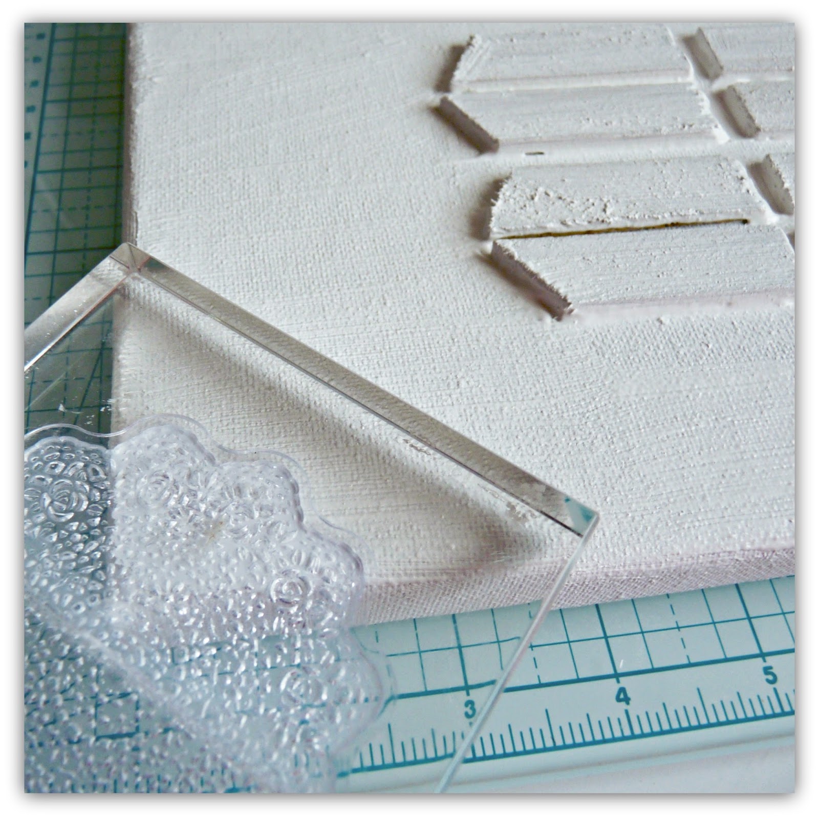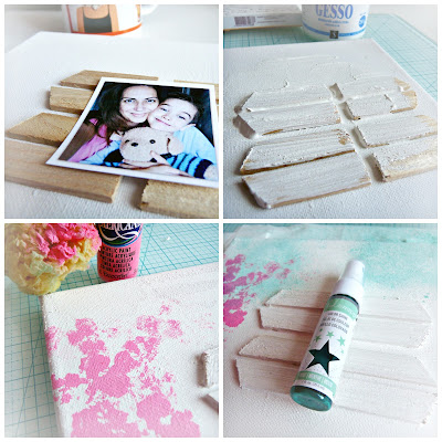 Partí de la foto con mi hijo que había elegido. Despues, tome un lienzo que tenía por casa. Cogí los trocitos de madera que vienen por si necesitas tensar mas el lienzo y los pegue donde quería que fuese la foto. Empece a dar gesso que compre esa misma mañana en el bricolaje porque no tenia! jajaja (ha sido la primera vez que lo he usado) y lo extendí por todo el lienzo y por encima de los listoncitos de madera. Antes de que se secase el gesso le puse con un sello imprimaciones por la parte inferior y superior para dar esa sensación de desquebrajado que os comentaba antes (la foto de este momento la encontráis debajo de este collage).