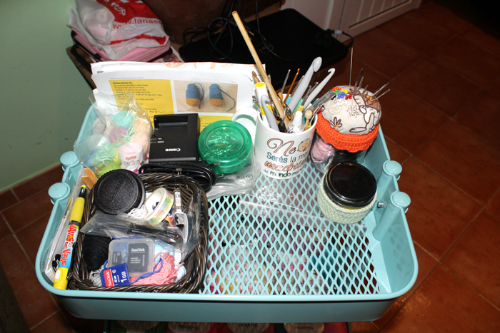 Me apañaba teniendo lo esencial para el trabajo que estaba haciendo en una bolsa de tela, pero cada vez que necesitaba un ovillo diferente u otros ojos de seguridad, tenía que subir a mi cuarto a por ello. Varias veces al día. Al final, acumulaba tal cantidad de cosas en la bolsa de tela que no encontraba nada.