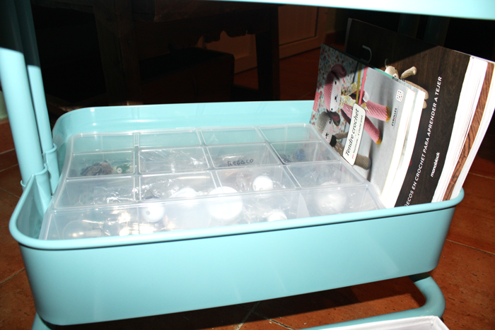 Y en la bandeja inferior guardo el trípode, los ovillos que tengo de restos por si los necesito alguna vez, que un apuro los tiene cualquiera, los libros de amigurumis (mi biblioteca asciende ya a 4 libro :D) y una cajita de compartimentos en la que tengo los ojos de seguridad, sonajeros...