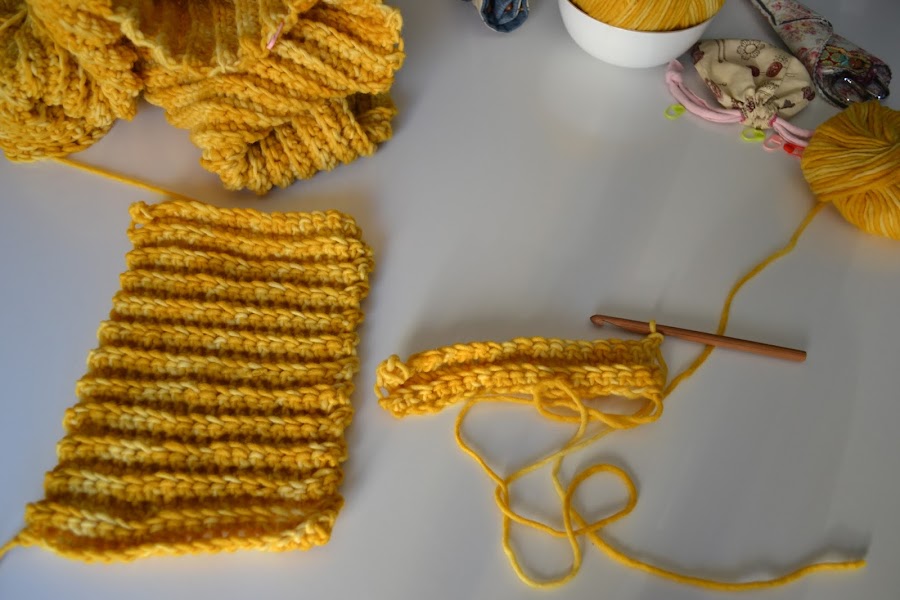 Tenemos que tejer otros dos rectángulos más pequeños, estos serán de 18 puntos cadena y 24 vueltas, estos serán nuestros puños.