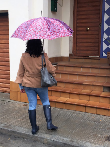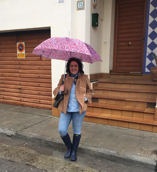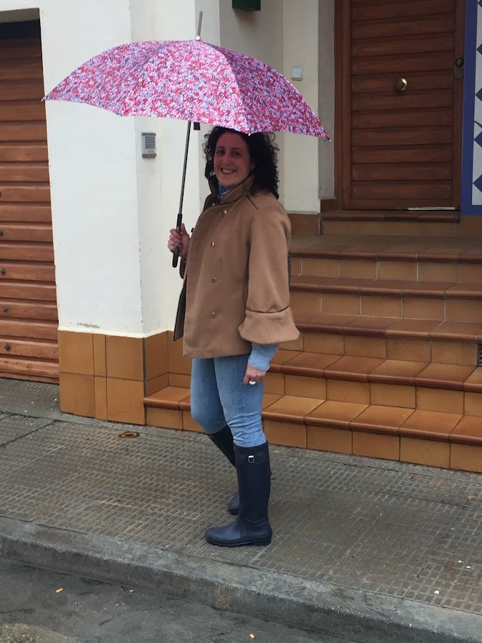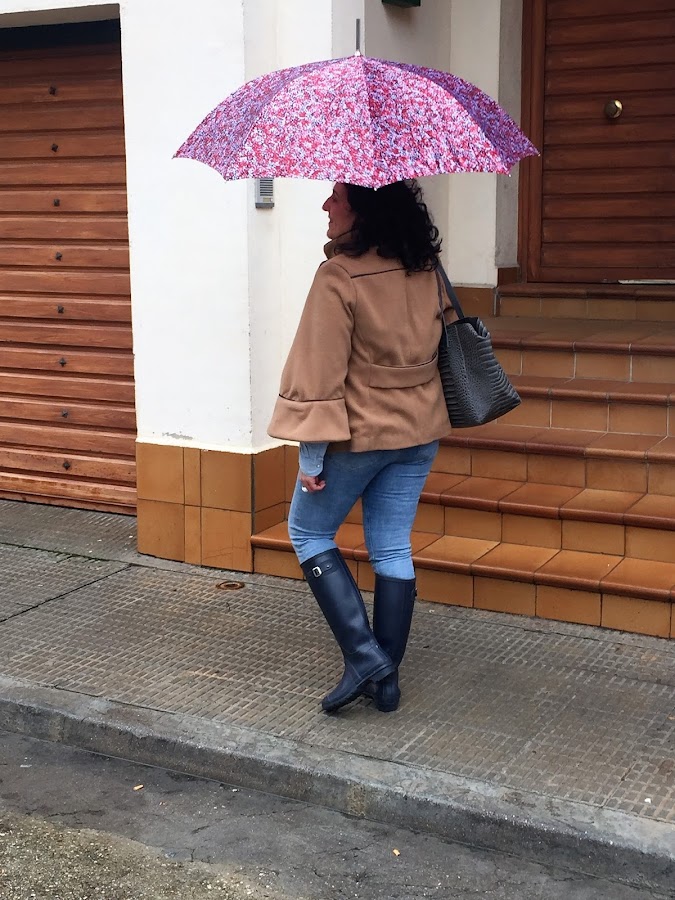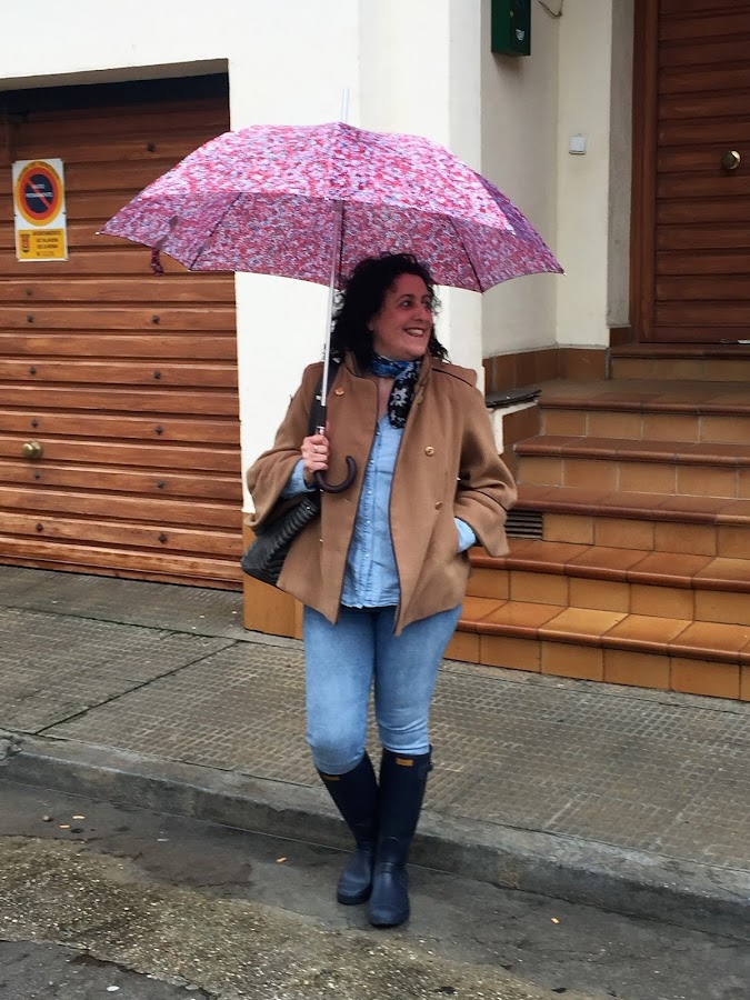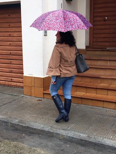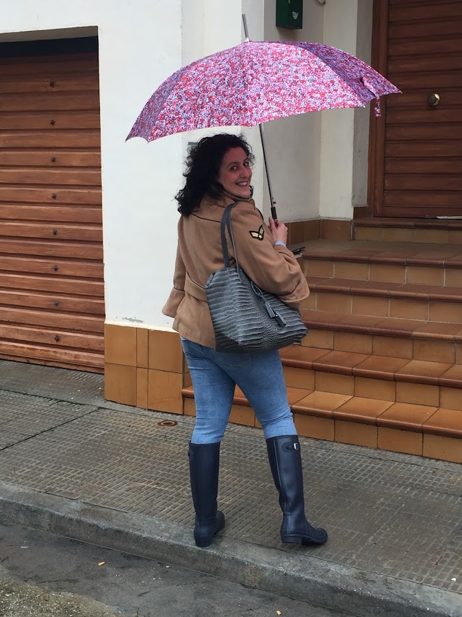 En un día de lluvia pensé que era buena combinación con un total look vaquero, con mis botas de agua, un bonito paraguas y un pañuelo al cuello.